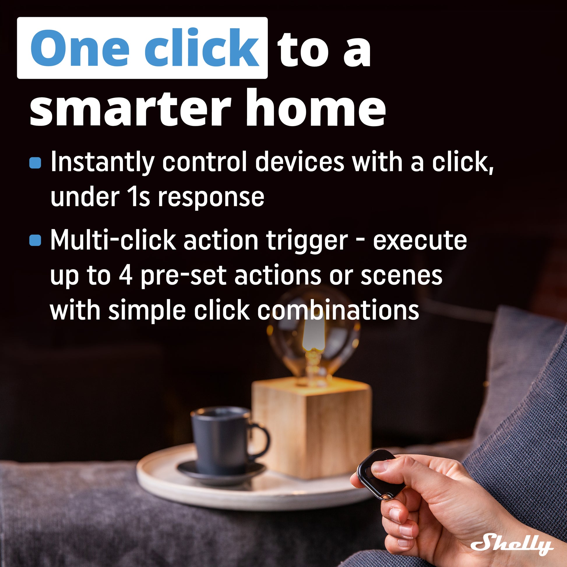 Shelly BLU Button1 es un botón Bluetooth portátil con cuatro combinaciones de activación (pulsación simple, doble, triple y prolongada). Tiene un diseño compacto, batería de larga duración y se conecta a través de la puerta de enlace Shelly BLU para un control inteligente de escenas y dispositivos.